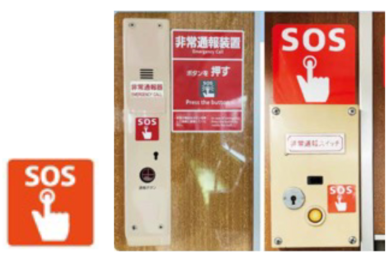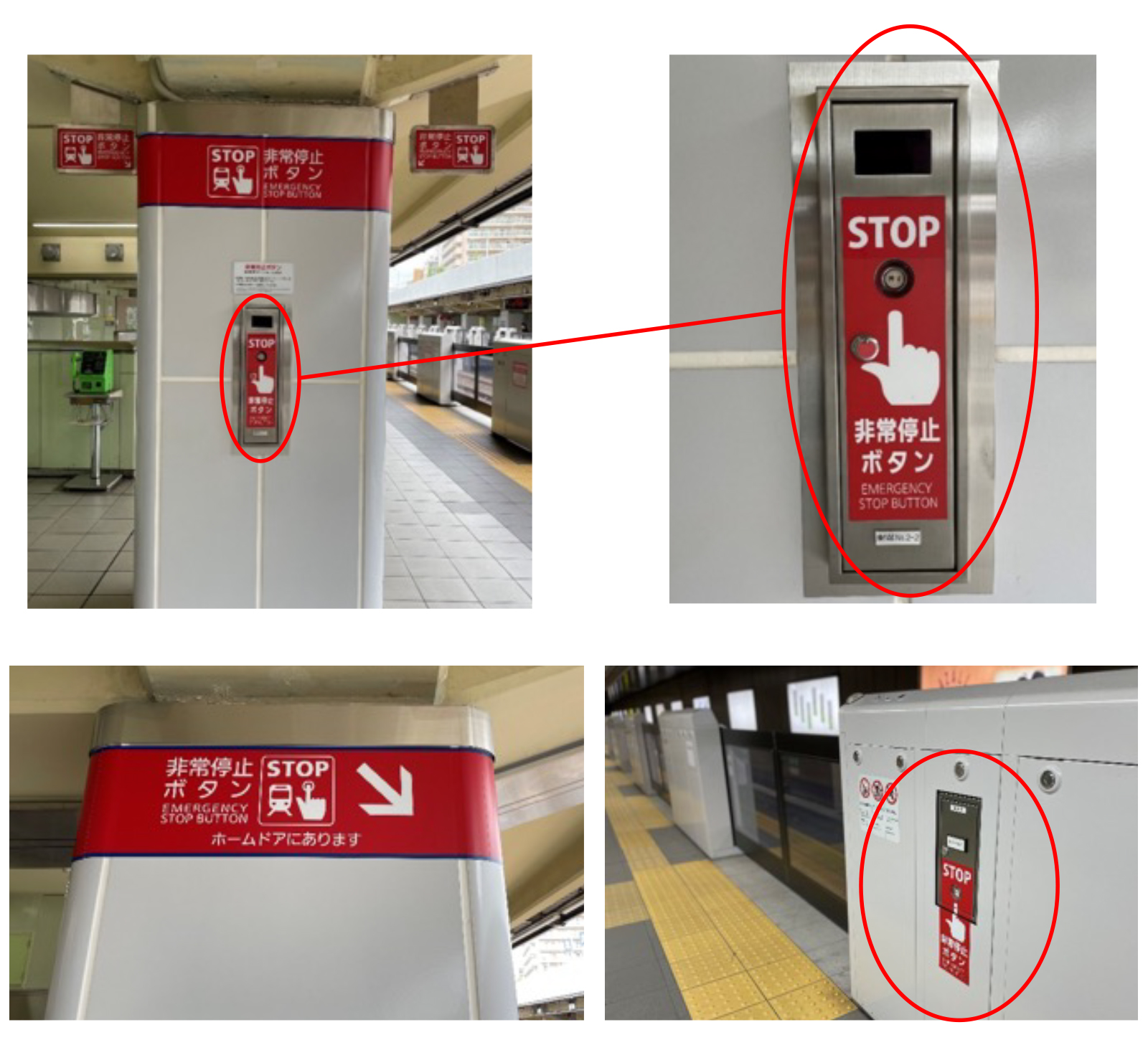 各駅ホームには、列車に停止合図を表示する「非常停止ボタン」を設置しています。軌道内への転落等の危険な状況を発見された場合には、ホームの柱やホーム柵に設置している「非常停止ボタン」を押してください。